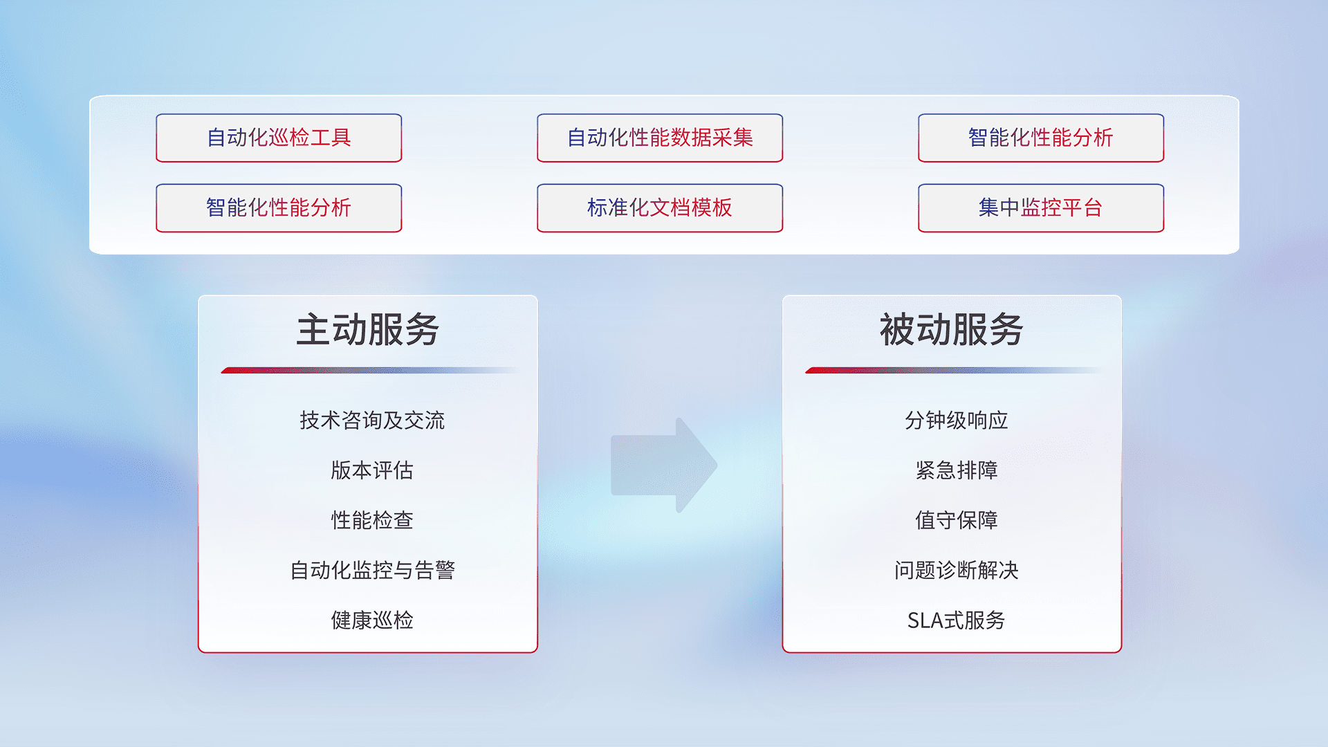 智能化工具和标准化文档,,保障服务质量,,,提供主动服务(包含技术咨询、、、、版本评估、、、、性能检查、、、自动化监控与告警、、、、健康巡检)和被动服务包含(分钟级响应、、、、紧急排障、、值守保障、、、、问题诊断解决、、SLA服务)。。。。